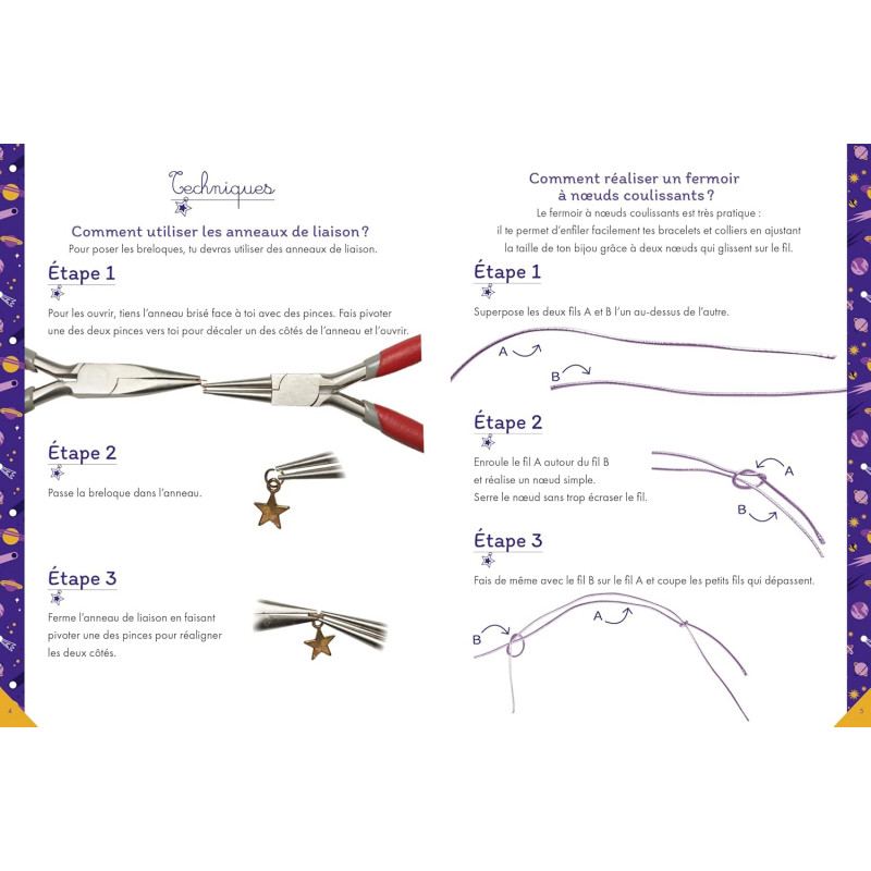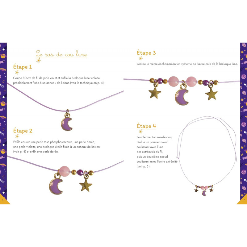 Un coffret avec tout le matériel nécessaire à la création de 5 bijoux : des grosses perles rondes phosphorescente violettes, des breloques étoiles, lune et planète, du élastique et du fil de jade violet. Le tout permettant de faire deux bracelets, une bague, 1 paire de boucles d'oreilles et un sautoir sur le thème cosmique/galaxie. Grâce au livre explicatif de 16 pages avec des pas à pas illustrés, l'enfant va pouvoir réaliser des bijoux phosphorescents et connectés à l'univers prêts à être portés.