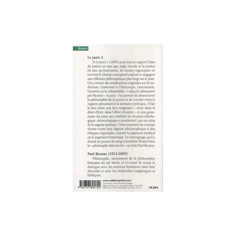 Si Le Juste 1 (1995) avait mis en rapport l'idée de justice en tant que règle morale et la justice en tant qu'institution, les études regroupées ici ouvrent le champ conceptuel exploré et engagent une réflexion philosophique plus large sur le juste. On y trouve des méditations originales sur la traduction, l'universel et l'historique, l'autonomie, l'autorité ou la vulnérabilité. L'adjectif substantivé par Ricoeur — le juste — lui permet de désenclaver la philosophie de la justice et de circuler entre le registre personnel et le domaine politique.