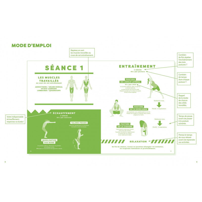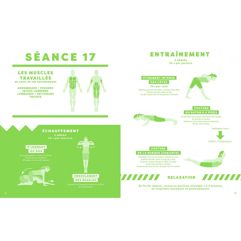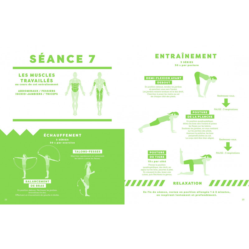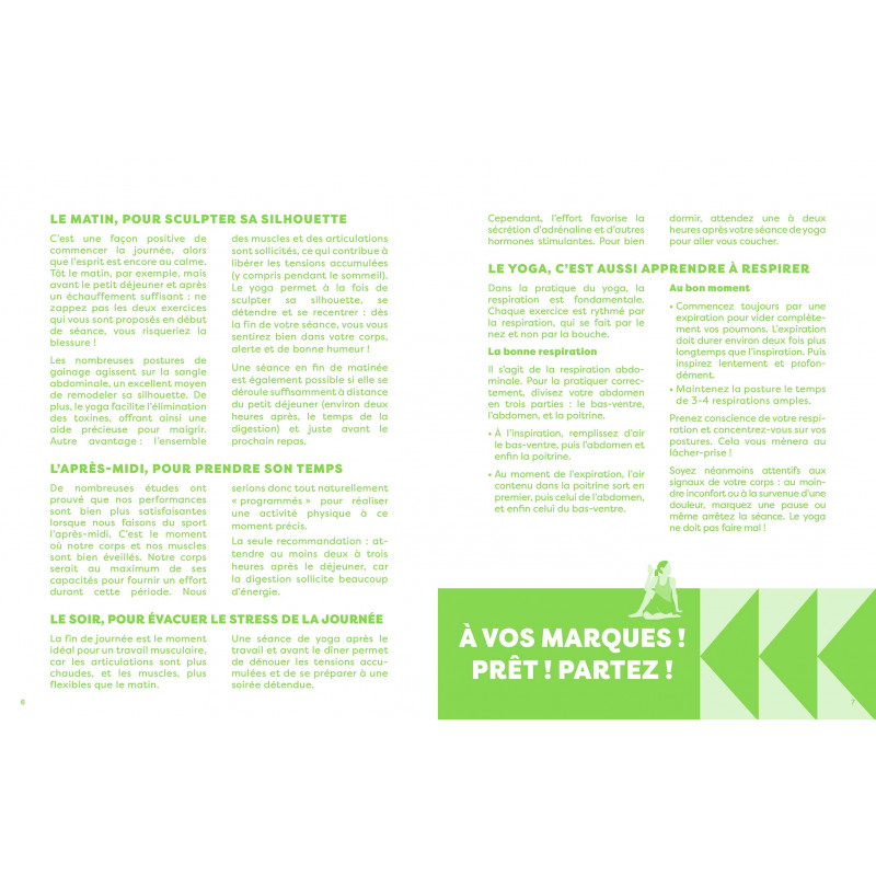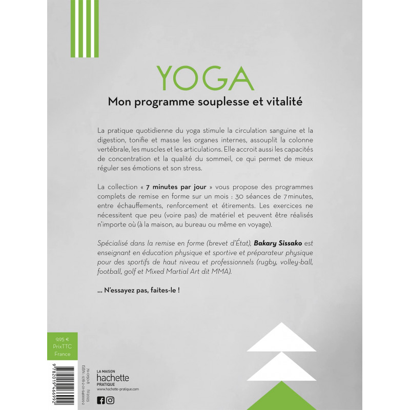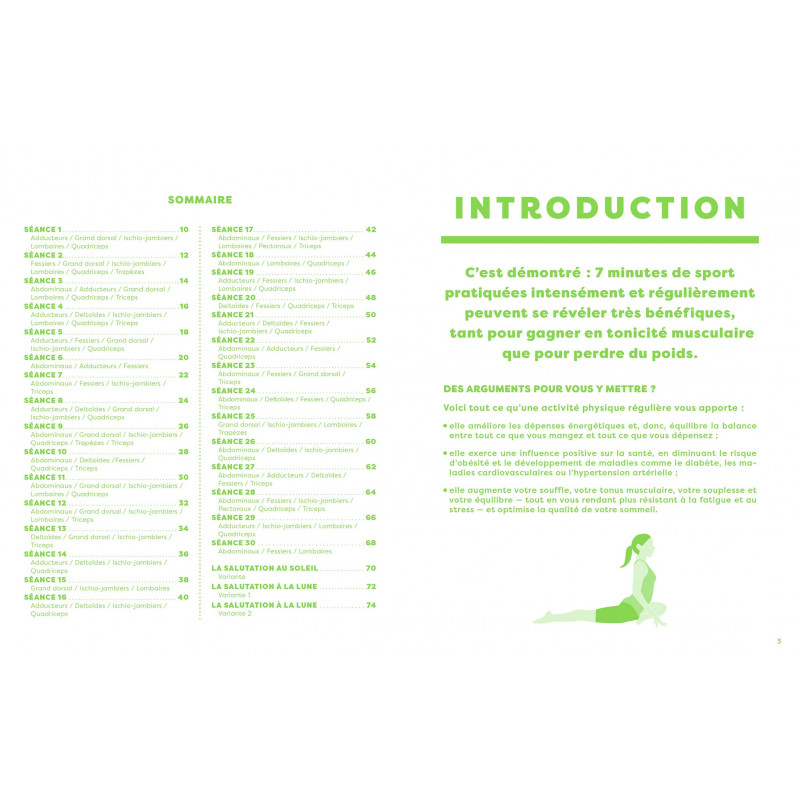 La pratique régulière du yoga stimule la circulation sanguine et la digestion, tonifie et masse les organes internes et assouplit la colonne vertébrale, les muscles et les articulations. Il permet également d'accroître les capacités de concentration et la qualité du sommeil, de mieux réguler ses émotions, de gérer le stress. La collection : " 7 minutes par jour " vous propose des programmes complets de remise en forme sur une durée d'un mois : 30 séances d'environ 7 minutes pour un entraînement de 3 exercices, précédés d'échauffements et suivis d'un retour au calme avec des étirements.