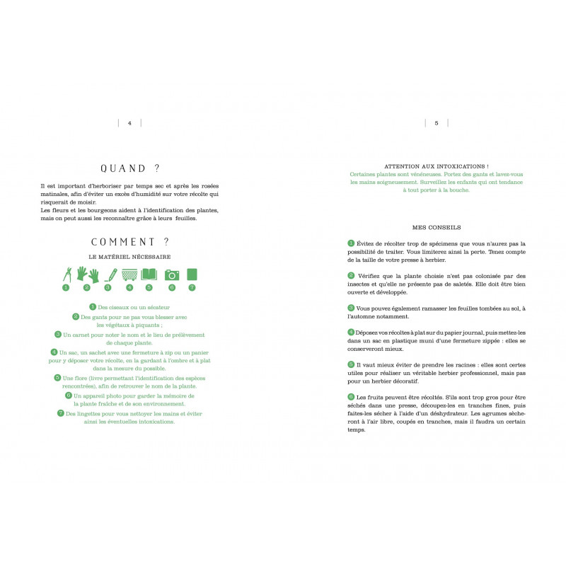 - Une reliure népalaise : à la fois solide pour vous accompagner dans vos pérégrinations et qui peut s'étoffer pour accueillir les feuilles et fleurs. - Un papier épais spécial qui permet de répertorier vos cueillettes. Polyvalent, il accueillera aussi bien vos annotations que vos croquis à l'aquarelle ou au crayon. - Un mode d'emploi au début de l'ouvrage pour accompagner les amateurs et amatrices.
