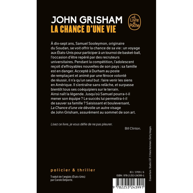 Il s'entraîne sans relâche, et surpasse bientôt tous ses coéquipiers sur le terrain. Ainsi naît la légende. Jusqu'où pourra-t-il mener son équipe ? Le succès lui permettra-t-il de sauver sa famille ? Saisissant et bouleversant, La Chance d'une vie dévoile un autre visage de John Grisham, assurément au sommet de son art. Traduit de l'anglais (Etats-Unis) par Carole Delporte.