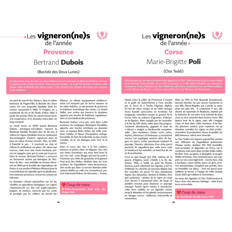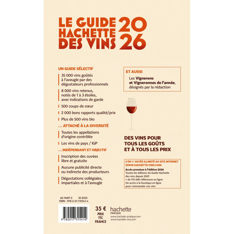 - UN GUIDE SELECTIF - 35 000 vins goûtés à l'aveugle par des dégustateurs professionnels - 8 000 vins retenus, notés de 1 à 3 étoiles, avec indications de garde - 500 coups de coeur - 2 000 bons rapports qualité/prix - Plus de 500 vins bio - ... ATTACHE A LA DIVERSITE - Toutes les appellations d'origine contrôlée - Les vins de pays / IGP - ... INDEPENDANT ET OBJECTIF - Inscription des cuvées libre et gratuite - Aucune publicité directe ou indirecte des producteurs - Dégustations collégiales, impartiales et à l'aveugle - ET AUSSI - Les Vignerons et Vigneronnes de l'année, désignés par la rédaction - 2 EN 1 ! ACCES ILLIMITE AU SITE INTERNET WWW.