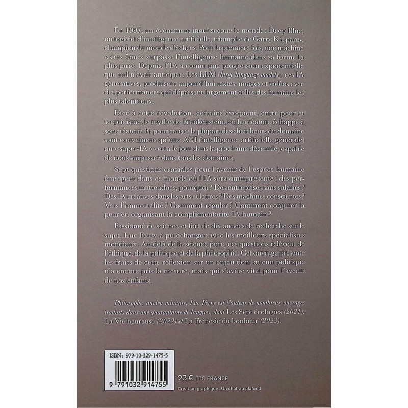 Face à cette révolution, certains évoquent, entre peur et scepticisme, le mythe de Frankenstein, où la créature échappe à son créateur. Et pour cause : la plupart des chercheurs du domaine sont convaincus qu'une AGI (intelligence artificielle générale) ou "super-IA" verra le jour dans la prochaine décennie, capable de nous surpasser dans tous les domaines. Sept questions cruciales pour l'avenir de l'espèce humaine émergent dans ce monde où l'IA sera omniprésente : des performances inattendues, pourquoi ? Des entreprises sans salariés ? Des IA créatives dans les arts et lettres ? Des machines conscientes ? Vers l'immortalité ? Comment réguler ? Comment conjurer la peur en organisant la complémentarité IA-humain ? Passionné de science et fort de dix années de recherche sur le sujet, Luc Ferry a pu échanger avec les meilleurs spécialistes mondiaux.