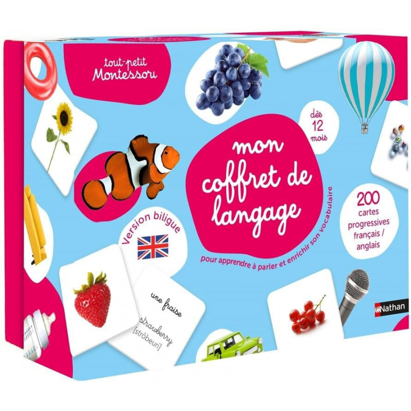 Offrez à votre bébé un départ linguistique exceptionnel avec ce coffret Montessori bilingue ! 200 cartes évolutives pour développer naturellement le vocabulaire en français et en anglais dès 12 mois. Mon coffret de langage bilingue : l'éveil linguistique Montessori pour les tout-petits. Inspiré de la pédagogie Montessori, ce coffret de langage bilingue est spécialement conçu pour accompagner le développement linguistique naturel de votre enfant dès 12 mois. Avec ses 200 cartes progressives français-anglais, il constitue un outil précieux pour enrichir le vocabulaire de votre tout-petit dans les deux langues. Un matériel pédagogique complet et évolutif : 200 cartes robustes adaptées aux petites mains Au recto : des photos réalistes pour une reconnaissance immédiate des objets Au verso : le mot correspondant en français et en anglais, accompagné d'une version phonétique simplifiée pour faciliter la prononciation Un livret explicatif pour guider les parents dans l'utilisation du coffret Les cartes couvrent 5 grandes catégories du quotidien de l'enfant : animaux , objets courants , instruments de musique, fruits et légumes, arbres et fleurs . Cette diversité permet d'explorer progressivement différents champs lexicaux essentiels au développement du langage. Une méthode progressive qui s'adapte à l'âge de l'enfant : Dès 12 mois : découverte des images et association avec les mots entendus Vers 18-24 mois : apprentissage actif du vocabulaire en français À partir de 2-3 ans : introduction progressive de l'anglais Offrez à votre enfant les bases d'un bilinguisme précoce avec ce coffret ludique et pédagogique !