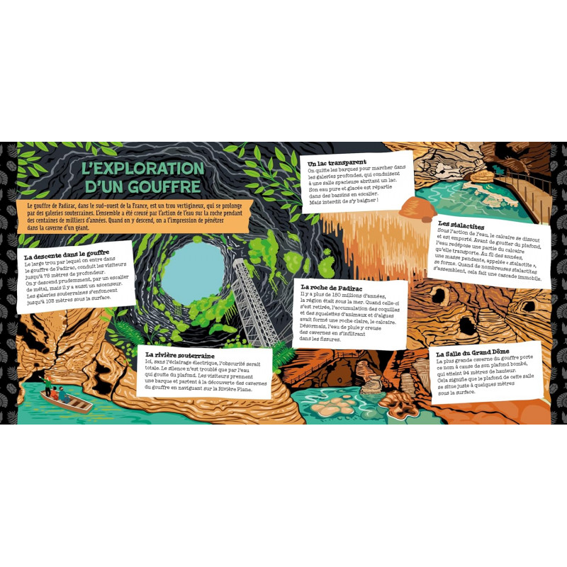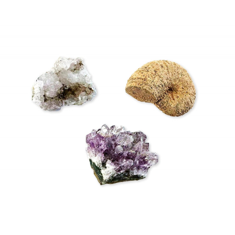 Un livre documentaire de 32 pages pour découvrir le monde des minéraux, des fossiles, des roches et des pierres précieuses. 1 lampe et ses piles fournies + 2 rondelles pour projeter 16 images de minéraux, fossiles et grottes. 1 imitation de fossile, 1 imitation d'améthyste et 1 imitation de pierre.