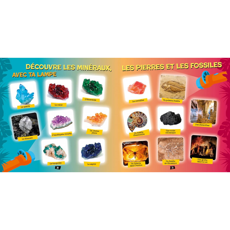 Un livre documentaire de 32 pages pour découvrir le monde des minéraux, des fossiles, des roches et des pierres précieuses. 1 lampe et ses piles fournies + 2 rondelles pour projeter 16 images de minéraux,...