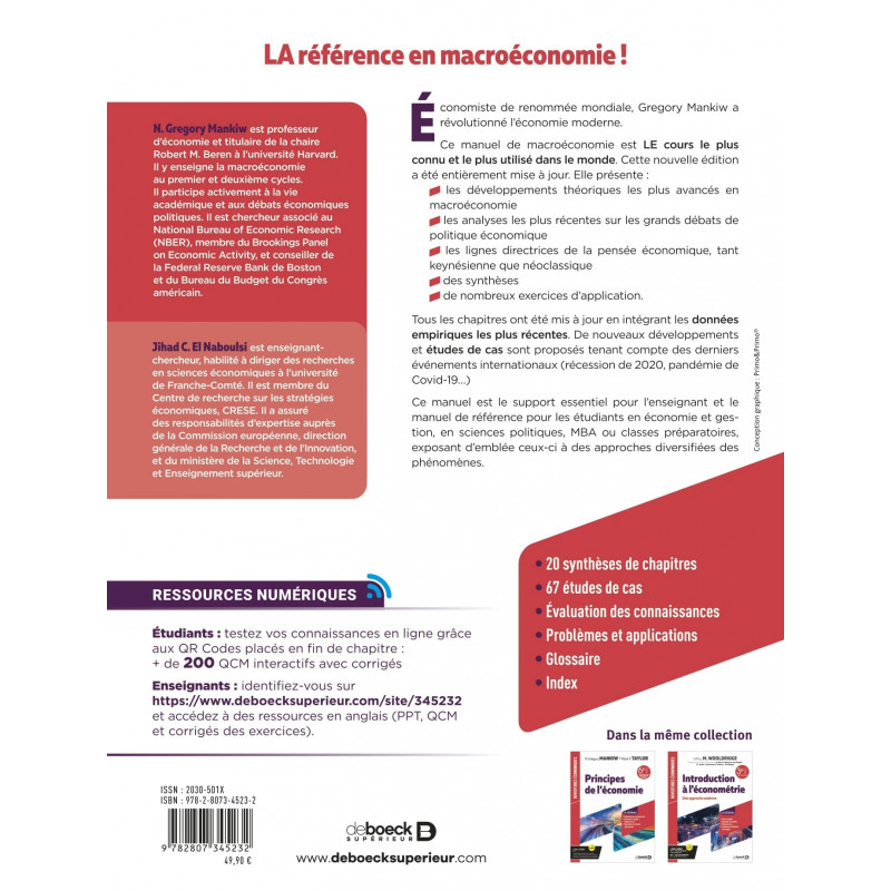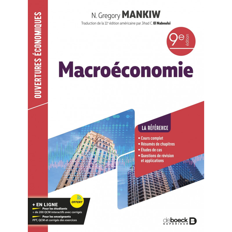 Economiste de renommée mondiale, Gregory Mankiw a révolutionné l'économie moderne. Il est l'un des représentants de la nouvelle économie keynésienne. Ce manuel de macroéconomie est LE cours le plus connu et le plus utilisé dans le monde. Cette nouvelle édition a été entièrement mise à jour. Elle présente : les développements théoriques les plus avancés en macroéconomie les analyses les plus récentes sur les grands débats de politique économique les lignes directrices de la pensée économique, tant keynésienne que (néo-)classique des modèles simples, plutôt qu'un modèle complexe à vocation universelle des synthèses et de nombreux exercices d'application.
