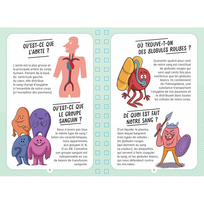 Un ouvrage de 112 pages, qui propose 212 questions sur le thème du corps humain, réparties en 4 thèmes : - Organes et squelette. - Le corps en mouvement. - Naître et grandir. - La santé. Les 4 parties sont séparées au moyen de 4 intercalaires. Quelques exemples de questions : Quel est le plus grand organe du corps ? Qu'est-ce que l'aorte ? Le coeur est-il un muscle ? Où a-t-on un limaçon ? Que voit un bébé à sa naissance ? Comment les os grandissent-ils ? La fièvre est-elle utile ? Qu'est-ce qu'une greffe ?