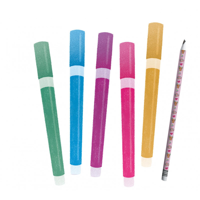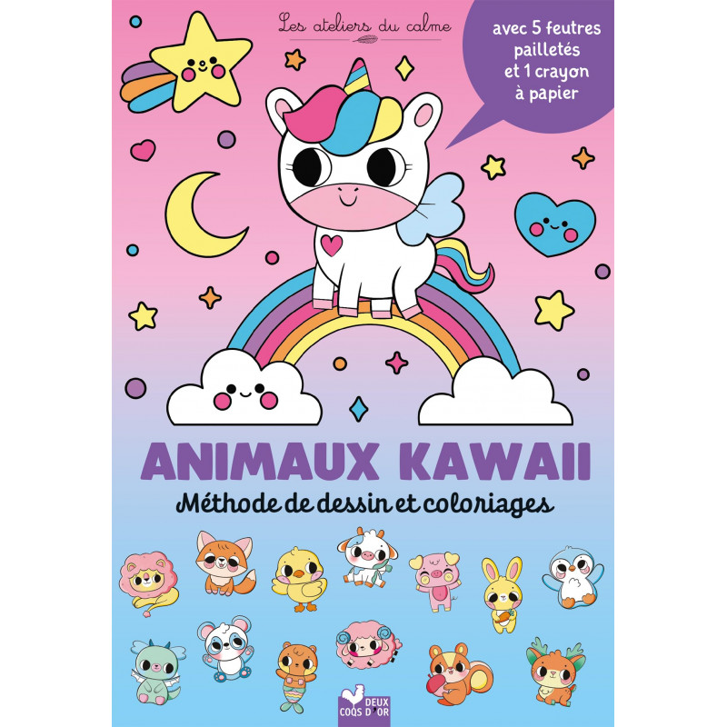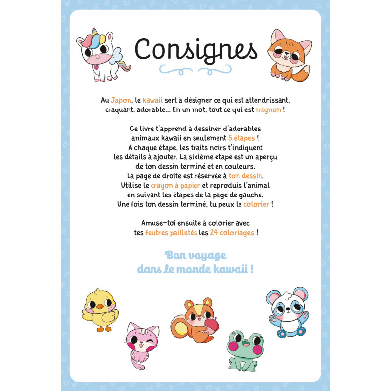 Un cahier de 96 pages contenant 20 pas-à-pas pour apprendre à dessiner des animaux kawaii super mignons (un chat, une licorne, une grenouille, un hamster...). Sur la page de gauche se trouve le pas-à-pas en 5 étapes, la 6e étape étant l'animal terminé et en couleur. À droite, une page vierge permet à l'enfant de dessiner grâce à un crayon à papier charté, avec une gomme au bout, tout en suivant les étapes. + 24 coloriages kawaii et 5 feutres pailletés (rose, violet, doré, vert clair et bleu clair). Les feutres et le crayon à papier sont rangés dans une pochette collée au plat III de la couverture cartonnée.