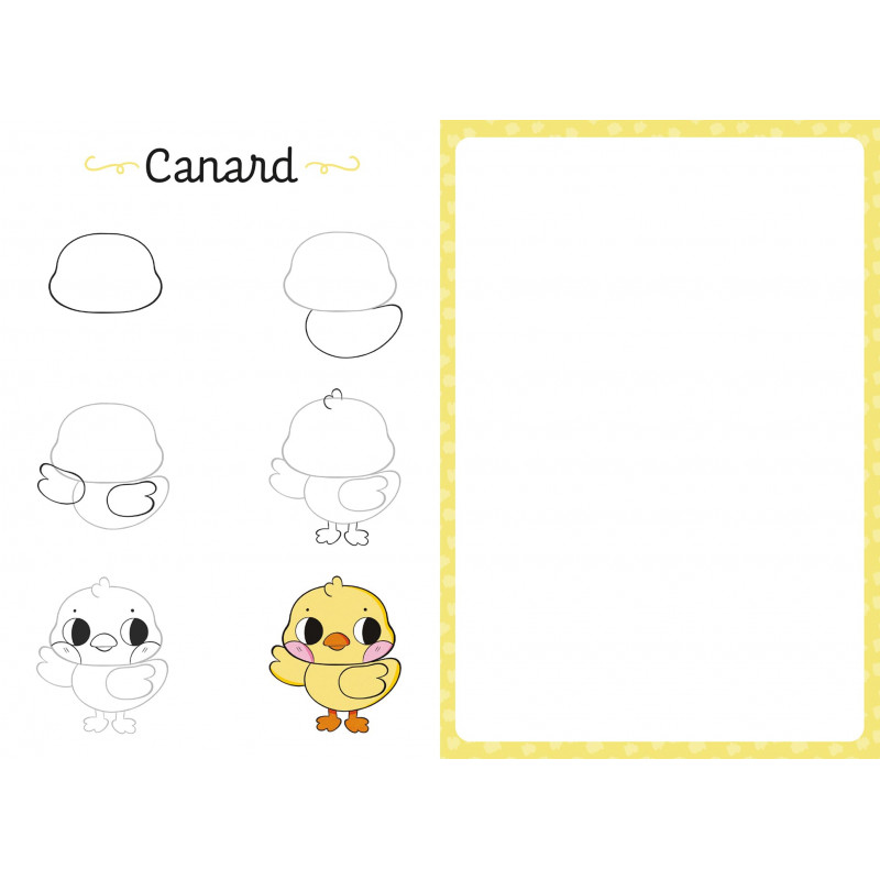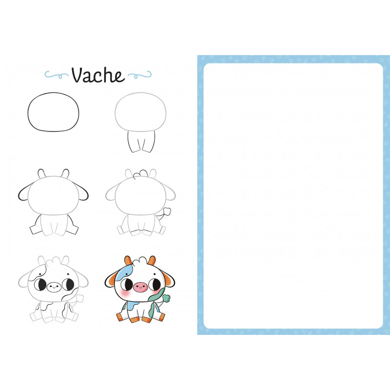 Un cahier de 96 pages contenant 20 pas-à-pas pour apprendre à dessiner des animaux kawaii super mignons (un chat, une licorne, une grenouille, un hamster...