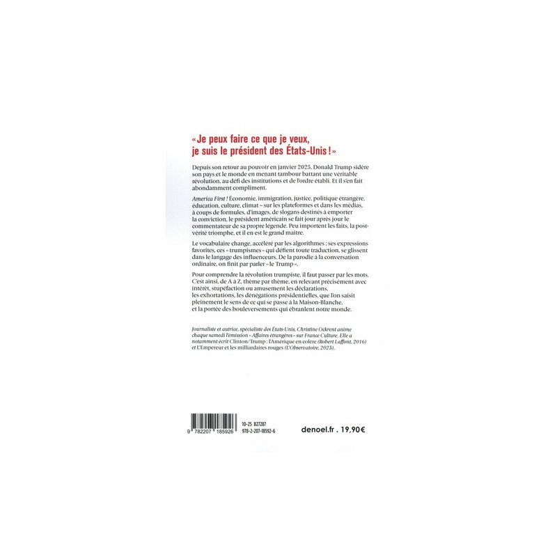 Peu importent les faits, la post-vérité triomphe, et il en est le grand maître. Le vocabulaire change, accéléré par les algorithmes ; ses expressions favorites, ces "trumpismes" qui défient toute traduction, se glissent dans le langage des influenceurs. De la parodie à la conversation ordinaire, on finit par parler "le Trump". Pour comprendre la révolution trumpiste, il faut passer par les mots. C'est ainsi, de A à Z, thème par thème, en relevant précisément avec intérêt, stupéfaction ou amusement les déclarations, les exhortations, les dénégations présidentielles, que l'on saisit pleinement le sens de ce qui se passe à la Maison-Blanche, et la portée des bouleversements qui ébranlent notre monde.