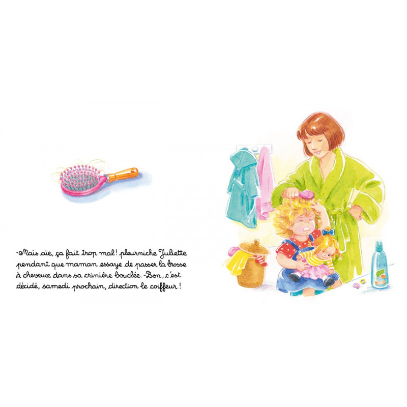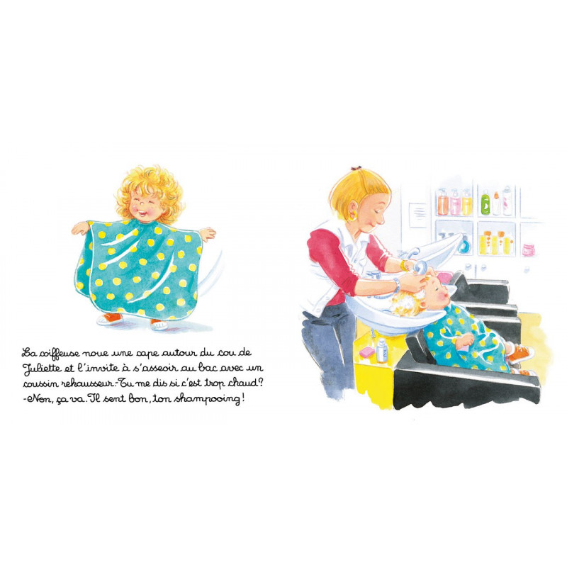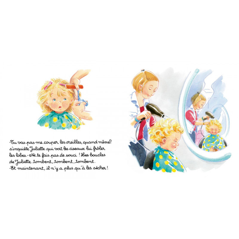 Notre petite héroïne se rend pour la première fois chez le coiffeur ! Elle y découvre des dames avec un drôle de papier dans les cheveux : on dirait des extraterrestres. et surtout, elle se fait pomponner et rêve d'une nouvelle coiffure ! Juliette sans ses belles boucles ? La coiffeuse et maman vont-elles dire oui ?