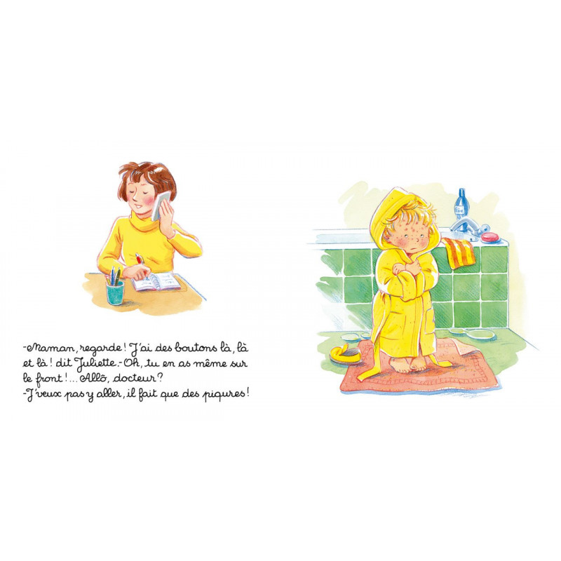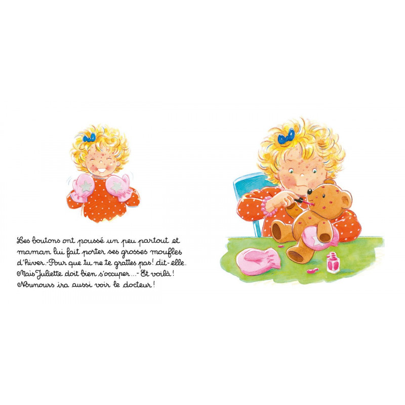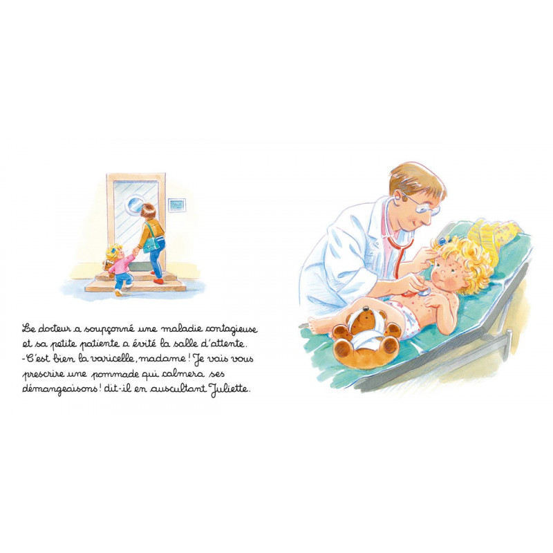 Dans Juliette chez le docteur, notre petite héroïne se réveille un matin avec de la fièvre et des boutons un peu partout... Sa maman appelle vite le docteur pour avoir un rendez-vous. « C' est la varicelle » confirme-t-il. Heureusement, Juliette a sa maman, son papa et son nounours pour lui remonter le moral et l' aider à ne pas trop... se gratter !
