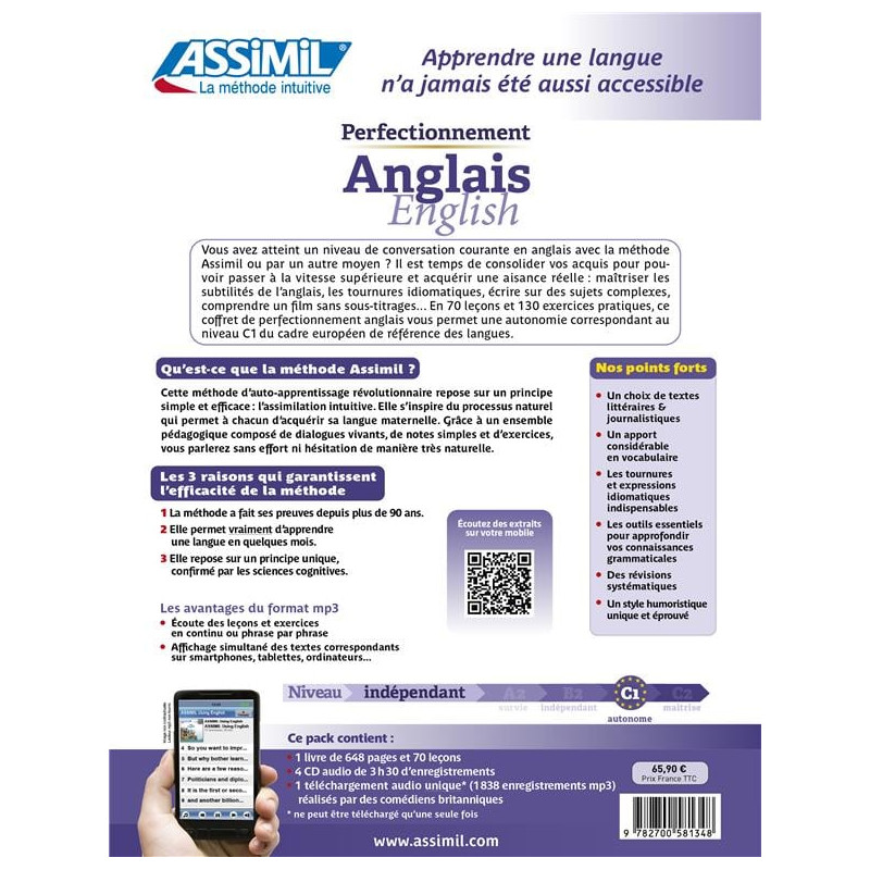 Cette méthode vous est destinée si vous avez déjà de bonnes connaissances générales de l’anglais, mais que vous vous sentez déconcerté face à des niveaux de langue ou des contextes insolites. Le vocabulaire que vous y rencontrerez est celui, contemporain, des médias, et les nombreuses notes culturelles vous plongeront dans l’esprit britannique le plus pur. Les enregistrements reprennent l’intégralité des textes en anglais des leçons et des exercices de traduction du livre. Ils sont interprétés par des locuteurs natifs professionnels. Ces enregistrements vous permettront d’afficher les textes correspondant aux dialogues pendant votre écoute. Idiomes et subtilités de la langue Un apport considérable en vocabulaire Un choix de textes variés TESTEZ VOTRE NIVEAU D'ANGLAIS