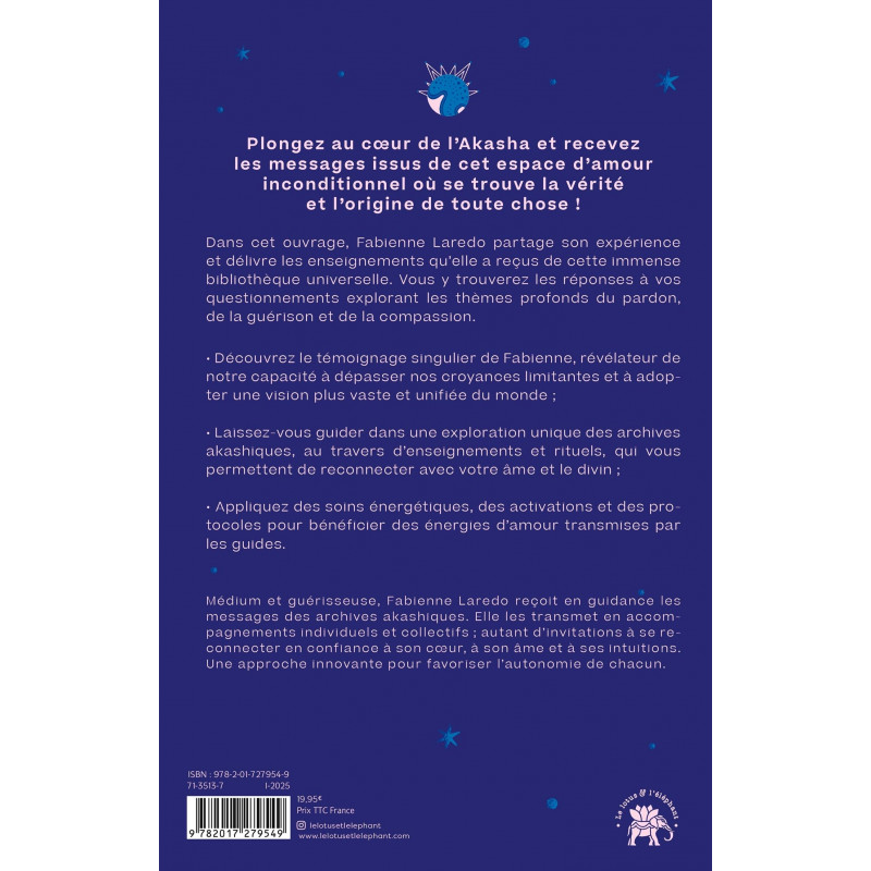 Dans cet ouvrage, Fabienne Laredo par tage son expérience et délivre les enseignements qu'elle a reçus de cette immense bibliothèque universelle. Vous y trouverez les réponses à vos questionnements explorant les thèmes profonds du pardon, de la guérison et de la compassion. - Découvrez le témoignage singulier de Fabienne, révélateur de notre capacité à dépasser nos croyances limitantes et à adopter une vision plus vaste et unifiée du monde ; - Laissez-vous guider dans une exploration unique des archives akashiques, au travers d'enseignements et rituels, qui vous permettent de reconnecter avec votre âme et le divin ; - Appliquez des soins énergétiques, des activations et des protocoles pour bénéficier des énergies d'amour transmises par les guides.