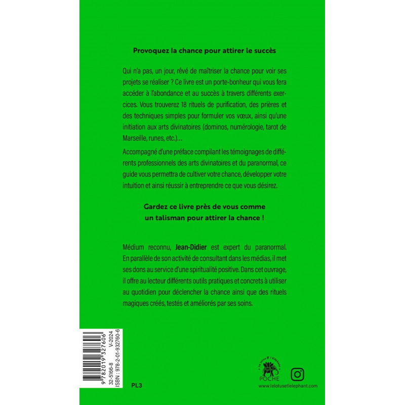 Accompagné d'une préface compilant les témoignages de différents professionnels des arts divinatoires et du paranormal, ce guide vous permettra de cultiver votre chance, développer votre intuition et ainsi réussir à entreprendre ce que vous désirez. Gardez ce livre près de vous comme un talisman pour attirer la chance ! Médium reconnu, Jean-Didier est expert du paranormal. En parallèle de son activité de consultant dans les médias, il met ses dons au service d'une spiritualité positive.