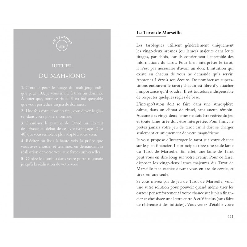 Provoquez la chance pour attirer le succès Qui n'a pas, un jour, rêvé de maîtriser la chance pour voir ses projets se réaliser ? Ce livre est un porte-bonheur qui vous fera accéder à l'abondance et au succès à travers différents exercices. Vous trouverez 18 rituels de purification, des prières et des techniques simples pour formuler vos vœux, ainsi qu'une initiation aux arts divinatoires (dominos, numérologie, tarot de Marseille, runes, etc.)...