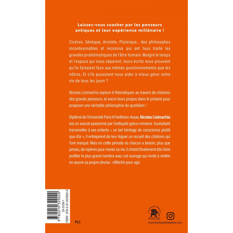 Laissez-vous coacher par les penseurs antiques et leur expérience millénaire ! Cicéron, Sénèque, Aristote, Plutarque... des philosophes incontournables et reconnus qui ont tous traité les grandes problématiques de l'être humain. Malgré le temps et l'espace qui nous séparent, leurs écrits nous prouvent qu'ils faisaient face aux mêmes questionnements que les nôtres. Et s'ils pouvaient nous aider à mieux gérer notre vie de tous les jours ? Nicolas Lisimachio explore 6 thématiques au travers de citations des grands penseurs, et ancre leurs propos dans le présent pour proposer une véritable philosophie du quotidien !