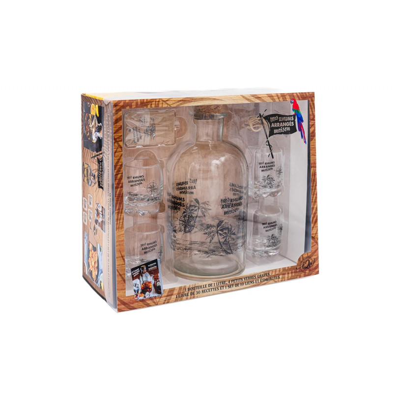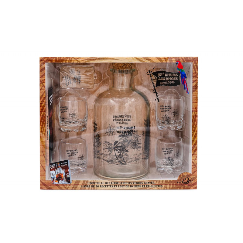 Les 20 recettes de rhums arrangés et de punchs sont à réaliser dans 1 bouteille en verre gravée de 1 000 ml , et à déguster dans 4 verres gravés. Le coffret comprend également, un jeu d'étiquettes et de liens en raphia.