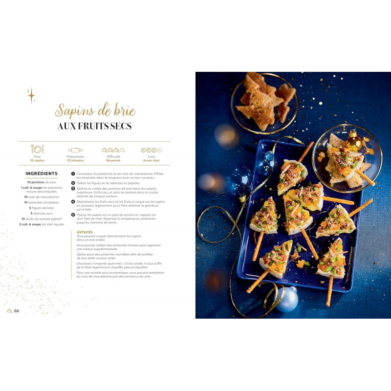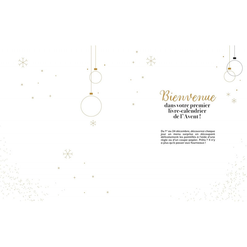 Jour après jour, découpez les pages de votre livre et découvrez au choix trois idées de recettes, un menu complet ou des astuces pour bien vous organiser et profiter au mieux des fêtes de fin d'année. Menus classiques avec des recettes traditionnelles et festives, menus de chef pour mettre les petits plats dans les grands, menus veggie ou spécial kids, idées cocktails... : il y en a pour tous les goûts ! Et une fois toutes les surprises révélées, il ne vous restera plus qu'à choisir ce que vous aurez envie de cuisiner pour passer des fêtes gourmandes et inoubliables !