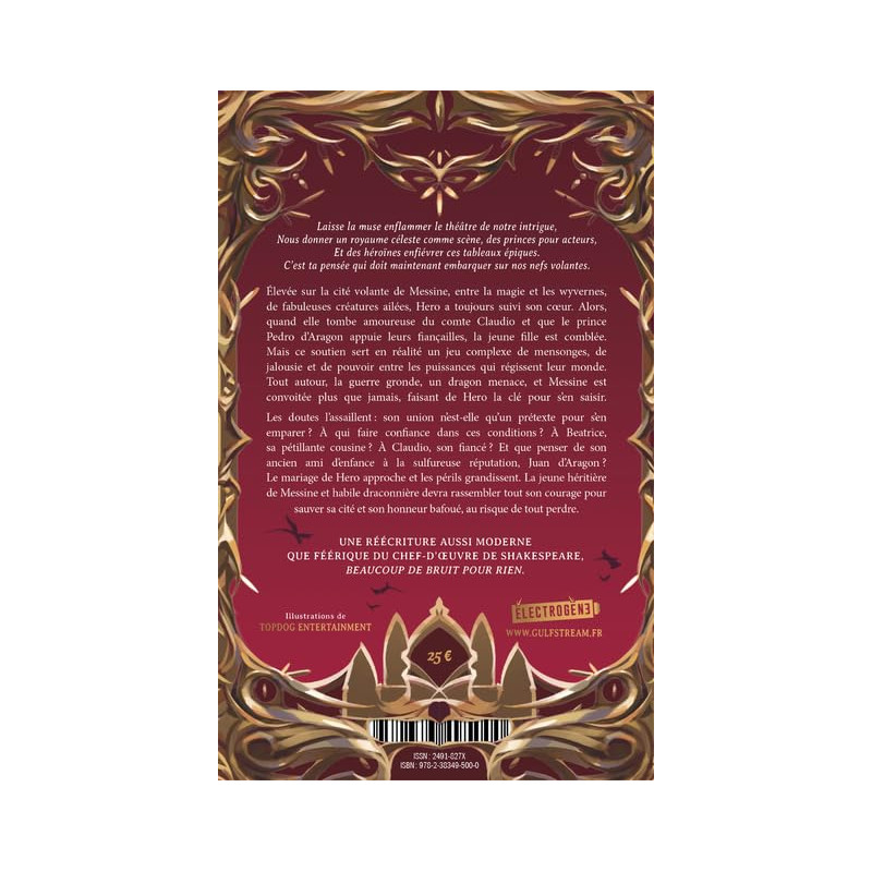 • Une réécriture aussi moderne que féérique de la pièce de Shakespeare, Beaucoup de bruit pour rien. • Des dragons, de la magie et des complots politiques qui secouent l'île flottante de Messine. • Plongez au sein d'une Italie baroque, entre mariage et jalousie. Laisse la muse enflammer le théâtre de notre intrigue, Nous donner un royaume céleste comme scène, des princes pour acteurs, Et des héroïnes animer ces tableaux épiques. C'est ta pensée qui doit maintenant embarquer sur nos nefs volantes. Élevée sur la cité volante de Messine, entre la magie et les wyvernes, fabuleuses créatures ailées, Hero a toujours suivi son cœur. Alors quand elle tombe amoureuse du chevalier Claudio et que le prince Pedro d'Aragon appuie leurs fiançailles, la jeune fille est comblée. Mais ce soutien sert en réalité un jeu complexe de mensonges, de jalousie et de pouvoir entre les puissances qui régissent leur monde. Tout autour, la guerre gronde, un dragon menace, et Messine est convoitée plus que jamais, faisant de Hero la clé pour s'en saisir. Les doutes l'assaillent : son union n'est-elle qu'un prétexte pour s'en emparer ? Et que penser de son ancien ami d'enfance à la sulfureuse réputation, Juan d'Aragon ? Le mariage de Hero approche et les périls grandissent. La jeune héritière de Messine et habile draconnière devra rassembler tout son courage pour sauver sa cité et son honneur bafoué, au risque de tout perdre.