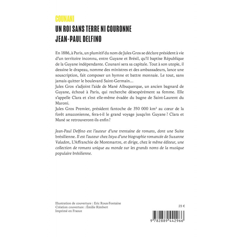 ENFIN LA SUITE DE GUYANES ! En 1886, à Paris, un plumitif du nom de Jules Gros se déclare président à vie d'un territoire inconnu, entre Guyane et Brésil, qu'il baptise République de la Guyane indépendante. Counani sera sa capitale. Tout à son utopie, il dessine le drapeau, nomme des ministres et des ambassadeurs, lance une souscription, fait composer un … ENFIN LA SUITE DE GUYANES ! En 1886, à Paris, un plumitif du nom de Jules Gros se déclare président à vie d'un territoire inconnu, entre Guyane et Brésil, qu'il baptise République de la Guyane indépendante. Counani sera sa capitale. Tout à son utopie, il dessine le drapeau, nomme des ministres et des ambassadeurs, lance une souscription, fait composer un hymne et battre monnaie. Le tout, sans jamais quitter le boulevard Saint-Germain... Jules Gros s'adjoint l'aide de Mané Albuquerque, un ancien bagnard de Guyane, échoué à Paris, qui recherche désespérément sa femme. Elle s'appelle Clara et s'est elle-même évadée du bagne de Saint-Laurent du Maroni. Jules Gros Premier, président fantoche de 350 000 km2 au coeur de la forêt amazonienne, fera-t-il le grand voyage jusqu'en Guyane ? Clara et Mané se retrouveront-ils enfin ?