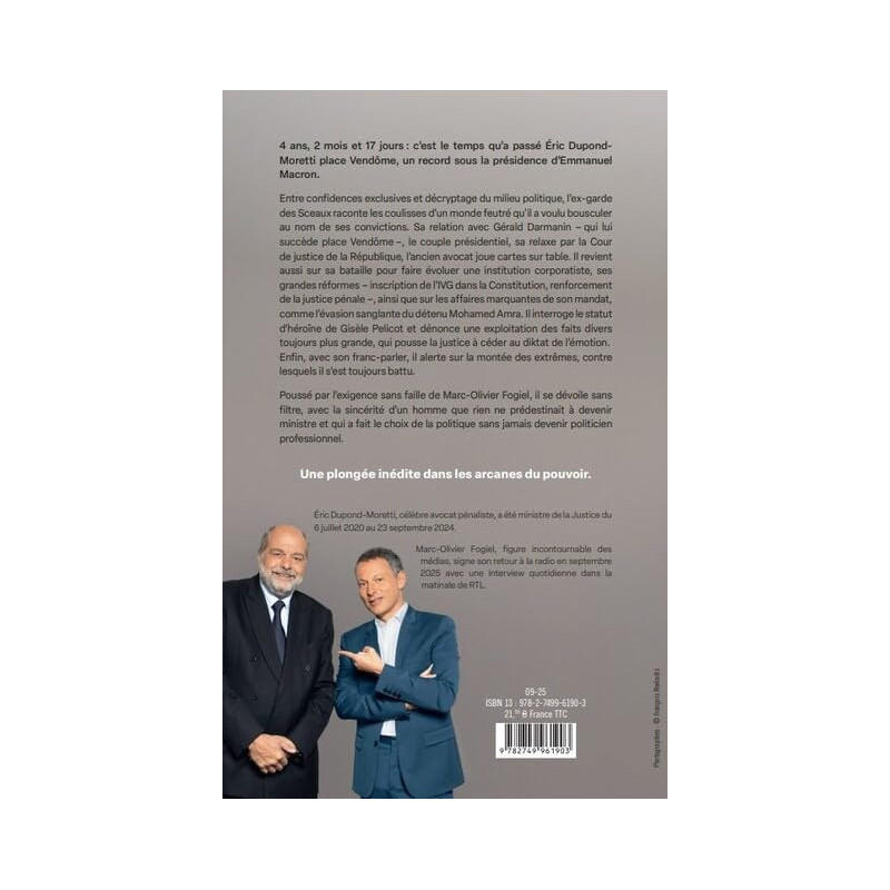 Le témoignage coup de poing d'un ministre hors norme : premier avocat pénaliste à devenir garde des Sceaux, Eric Dupond-Moretti se livre sans concession sur ses quatre années passées place Vendôme. 4 ans, 2 mois et 17 jours : c'est le temps qu'a passé Eric Dupond-Moretti place Vendôme, un record sous la présidence d'Emmanuel Macron. Entre … Le témoignage coup de poing d'un ministre hors norme : premier avocat pénaliste à devenir garde des Sceaux, Eric Dupond-Moretti se livre sans concession sur ses quatre années passées place Vendôme. 4 ans, 2 mois et 17 jours : c'est le temps qu'a passé Eric Dupond-Moretti place Vendôme, un record sous la présidence d'Emmanuel Macron. Entre confidences exclusives et décryptage du milieu politique, l'ex-garde des Sceaux raconte les coulisses d'un monde feutré qu'il a voulu bousculer au nom de ses convictions. Sa relation avec Gérald Darmanin - qui lui succède place Vendôme -, le couple présidentiel, sa relaxe par la Cour de justice de la République, l'ancien avocat joue cartes sur table. Il revient aussi sur sa bataille pour faire évoluer une institution corporatiste, ses grandes réformes - inscription de l'IVG dans la Constitution, renforcement de la justice pénale -, ainsi que sur les affaires marquantes de son mandat, comme l'évasion sanglante du détenu Mohamed Amra. Il interroge le statut d'héroïne de Gisèle Pelicot et dénonce une exploitation des faits divers toujours plus grande, qui pousse la justice à céder au diktat de l'émotion. Enfin, avec son franc-parler, il alerte sur la montée des extrêmes, contre lesquels il s'est toujours battu. Poussé par l'exigence sans faille de Marc-Olivier Fogiel, il se dévoile sans filtre, avec la sincérité d'un homme que rien ne prédestinait à devenir ministre et qui a fait le choix de la politique sans jamais devenir politicien professionnel.