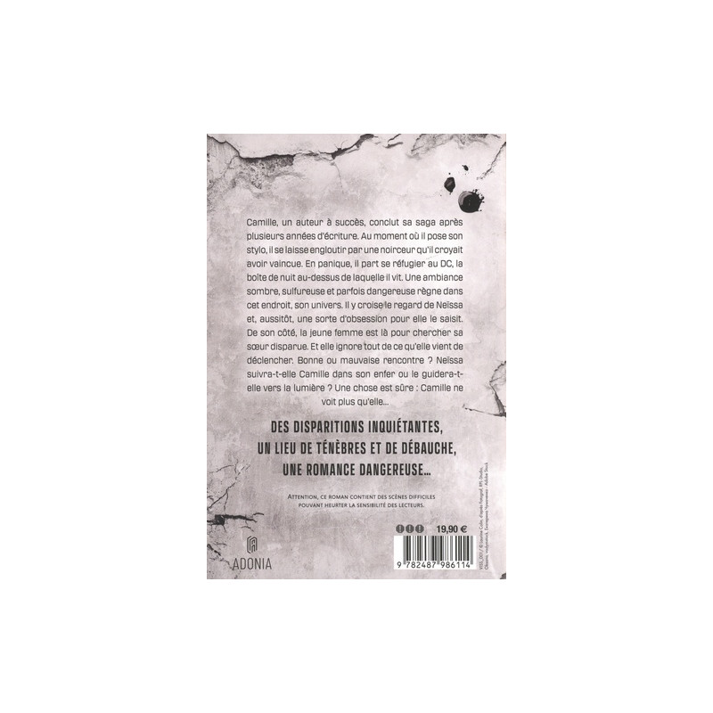L'édition avec jaspage est une édition limitée. Après épuisement des stocks avec jaspage, le livre sera édité en version classique avec tranche blanche. Camille, un auteur à succès, conclut sa saga après plusieurs années d'écriture. Au moment où il pose son stylo, il se laisse engloutir par une noirceur qu'il croyait avoir vaincue. En panique, il part se réfugier au … L'édition avec jaspage est une édition limitée. Après épuisement des stocks avec jaspage, le livre sera édité en version classique avec tranche blanche. Camille, un auteur à succès, conclut sa saga après plusieurs années d'écriture. Au moment où il pose son stylo, il se laisse engloutir par une noirceur qu'il croyait avoir vaincue. En panique, il part se réfugier au DC, la boîte de nuit au-dessus de laquelle il vit. Une ambiance sombre, sulfureuse et parfois dangereuse règne dans cet endroit, son univers. Il y croise le regard de Neïssa et, aussitôt, une sorte d'obsession pour elle le saisit. De son côté, la jeune femme est là pour chercher sa sœur disparue. Et elle ignore tout de ce qu'elle vient de déclencher. Bonne ou mauvaise rencontre ? Neïssa suivra-t-elle Camille dans son enfer ou le guidera-telle vers la lumière ? Une chose est sûre : Camille ne voit plus qu'elle...