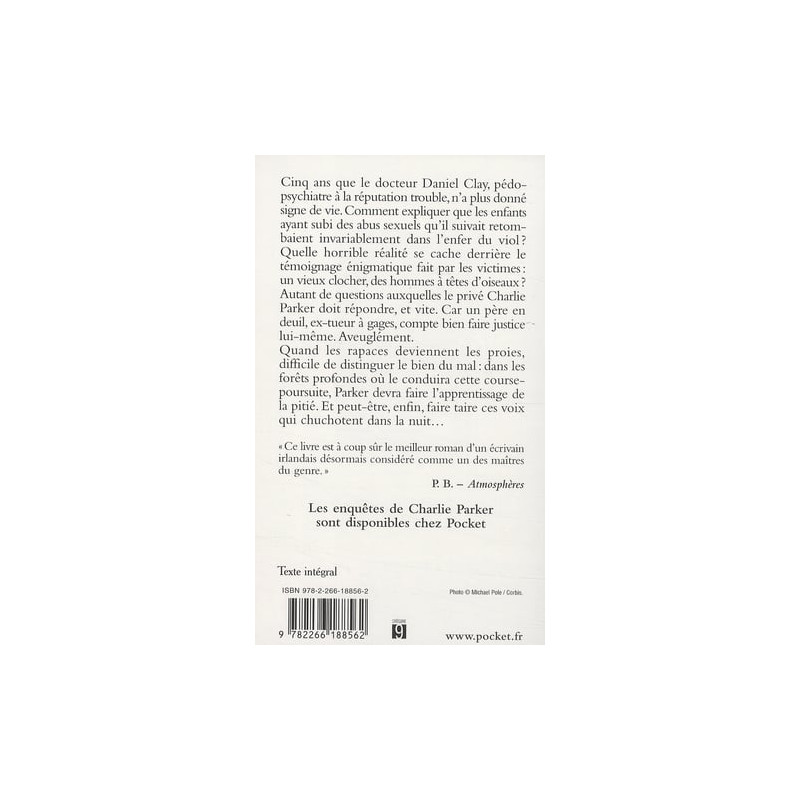 Une nouvelle enquête pour Charlie Parker, sur les traces d'un grand psychiatre accusé, à tort selon ses proches, de pédophilie... Cinq ans que le Dr Daniel Clay, pédopsychiatre à la réputation trouble, n'a plus donné signe de vie. Comment expliquer que les enfants ayant subi des abus sexuels, qu'il suivait en thérapie, retombaient invariablement dans l'enfer du … Une nouvelle enquête pour Charlie Parker, sur les traces d'un grand psychiatre accusé, à tort selon ses proches, de pédophilie... Cinq ans que le Dr Daniel Clay, pédopsychiatre à la réputation trouble, n'a plus donné signe de vie. Comment expliquer que les enfants ayant subi des abus sexuels, qu'il suivait en thérapie, retombaient invariablement dans l'enfer du viol ? Quelle horrible réalité se cache derrière le témoignage énigmatique fait par les victimes : un vieux clocher, des hommes à têtes d'oiseaux ? Autant de questions auxquelles le privé Charlie Parker doit répondre. Car un père en deuil, ex-tueur à gages, compte bien faire justice lui-même. " Ce livre est à coup sûr le meilleur roman d'un écrivain irlandais désormais considéré comme un des maîtres du genre. " P. B. - Atmosphères Tous les grands succès de John Connolly sont chez Pocket