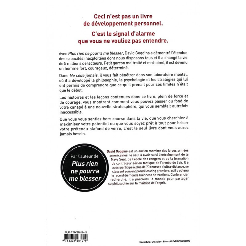 Avec Plus rien ne pourra me blesser, David Goggins a démontré l'étendue des capacités inexploitées dont nous disposons tous et il a changé la vie de 5 millions de lecteurs. Petit garçon maltraité et mal-aimé, il est devenu un homme fort, courageux, déterminé. Dans Ne cède jamais, il vous fait pénétrer dans son laboratoire mental, où il a développé la philosophie, la psychologie et les stratégies qui lui ont permis de comprendre que ce qu'il prenait pour ses limites n'était que le début.