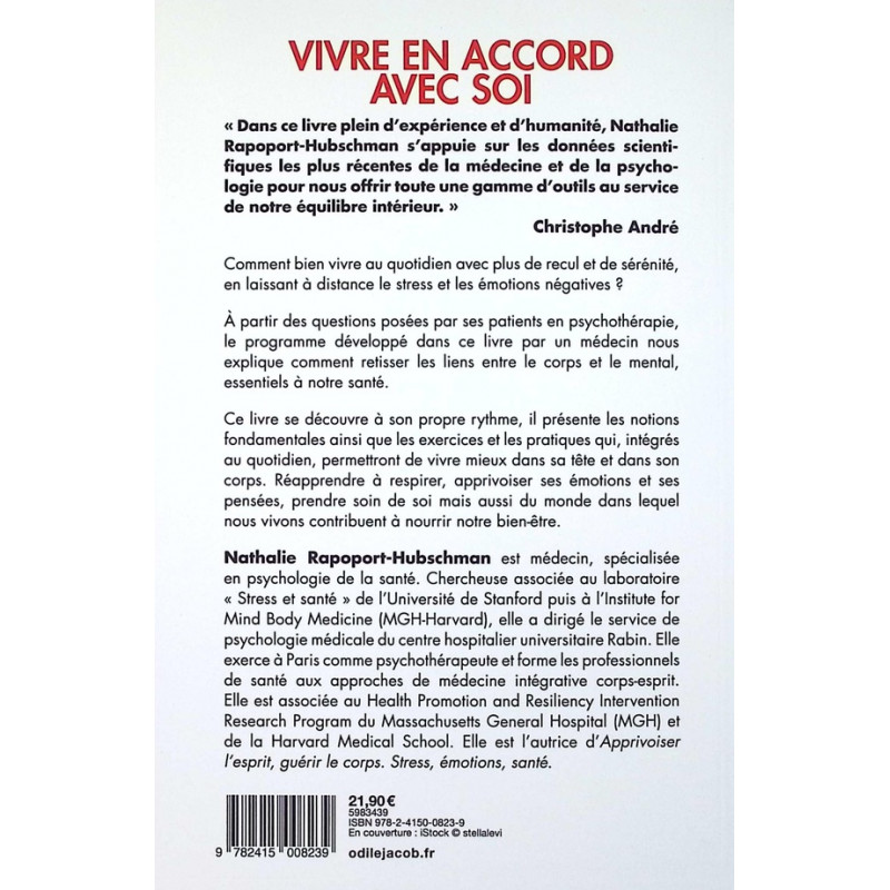 Comment bien vivre au quotidien avec plus de recul et de sérénité, en laissant à distance le stress et les émotions négatives ? A partir des questions posées par ses patients en psychothérapie, le programme développé dans ce livre par un médecin nous explique comment retisser les liens entre le corps et le mental, essentiels à notre santé. Ce livre se découvre à son propre rythme, il présente les notions fondamentales ainsi que les exercices et les pratiques qui, intégrés au quotidien, permettront de vivre mieux dans sa tête et dans son corps.