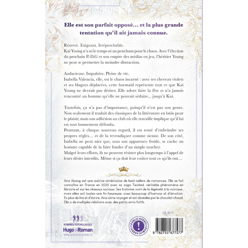 Exigeant. Irréprochable. Kai Young n'a pas le temps pour le désordre. Avec l'élection du prochain PDG et l'empire des médias en jeu, l'héritier Young ne peut se permettre la moindre distraction. Audacieuse. Impulsive. Pleine de vie. Isabella Valencia, elle, est le chaos incarné : avec ses cheveux violets et ses blagues déplacées, cette barmaid représente tout ce que Kai Young ne devrait pas désirer.