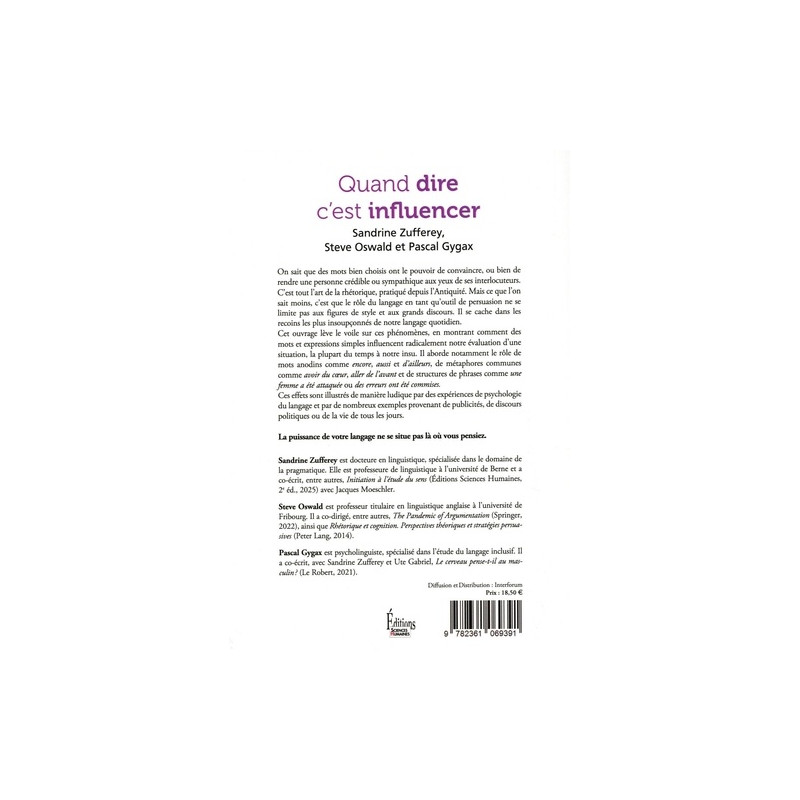 Depuis plus d'un siècle, la linguistique s'est développée en tant que discipline et s'est intéressée aux différents types d'influences que le langage exerce sur la pensée. Il est connu depuis longtemps que des mots bien choisis ont le pouvoir de convaincre ou de dissuader, de rendre une personne sympathique ou simplement plus crédible aux yeux de ses interlocuteurs. C'est tout l'art de la rhétorique, pratiqué depuis l'antiquité. Mais pendant des siècles, ces observations sont restées cantonnées à des manuels fondés sur des exemples spécifiques et des situations souvent inventées. Or, depuis quarante ans, l'essor de la psycholinguistique, de par sa capacité à tester au moyen des outils de la psychologie des phénomènes liés à la structure du langage et à son usage, a fondamentalement changé la donne. La linguistique peut à présent se définir comme une science humaine, car elle présente des résultats fondés empiriquement et qui ont grandement gagné en validité et en généralisation. Cet ouvrage se fait l'écho de l'union entre linguistique et psychologie, en présentant une série de phénomènes linguistiques du quotidien qui sont à l'origine de la puissance du langage en tant qu'outil de persuasion.