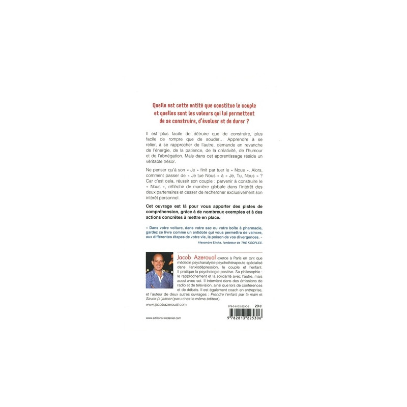Vivre en couple, cela s'apprend. Ce texte redigé avec le cœur par un médecin psychothérapeute, spécialiste du couple, a été conçu pour aider chacun à mieux comprendre le couple en général et mieux vivre à deux. Traitant aussi bien des fondements du couple, en tenant compte des particularités de notre époque, que de ses difficultés actuelles, il donne les moyens d'éviter les ruptures. Cet ouvrage très complet est le fruit d'une longue expérience. Enrichi de nombreux témoignages et empreint d'une réelle humanité, il devrait devenir le guide de tous ceux qui considèrent que le bonheur ça se construit et que leur couple en est l'essentiel.