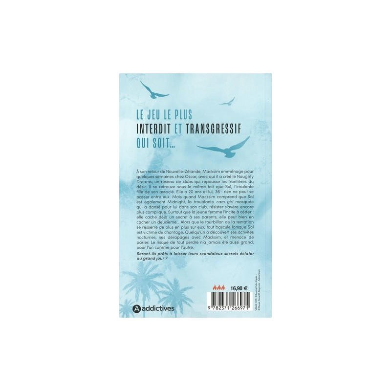 A son retour de Nouvelle-Zélande, Macksim emménage pour quelques semaines chez Oscar, avec qui il a créé le Naughty Dreams, un réseau de clubs qui repousse les frontières du désir. Il se retrouve sous le même toit que Sol, l'insolente fille de son associé. Elle a 20 ans et lui, 36 : rien ne peut se passer entre eux. Mais quand Macksim comprend que Sol est … A son retour de Nouvelle-Zélande, Macksim emménage pour quelques semaines chez Oscar, avec qui il a créé le Naughty Dreams, un réseau de clubs qui repousse les frontières du désir. Il se retrouve sous le même toit que Sol, l'insolente fille de son associé. Elle a 20 ans et lui, 36 : rien ne peut se passer entre eux. Mais quand Macksim comprend que Sol est également Midnight, la troublante cam girl masquée qui a dansé pour lui dans son club, résister s'avère encore plus compliqué. Surtout que la jeune femme l'incite à céder : elle cache déjà un secret à ses parents, elle peut bien en cacher un deuxième... Alors que le tourbillon de la tentation se resserre de plus en plus sur eux, tout bascule lorsque Sol est victime de chantage. Quelqu'un a découvert ses activités nocturnes, ses dérapages avec Macksim, et menace de parler. Le risque de tout perdre n'a jamais été aussi grand, pour l'un comme pour l'autre. Seront-ils prêts à laisser leurs scandaleux secrets éclater au grand jour ?
