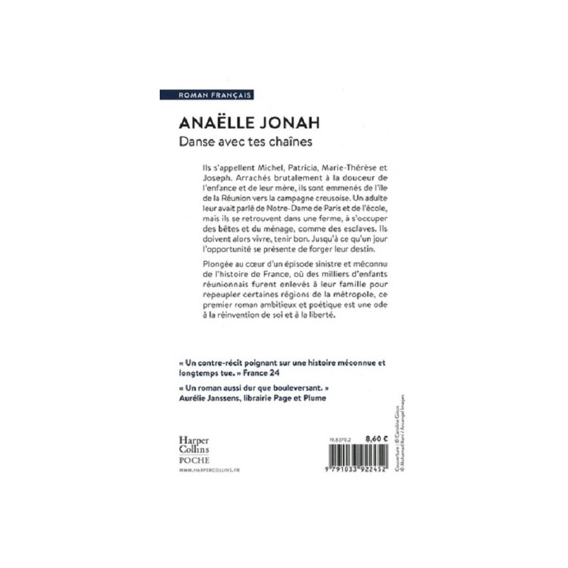 Danse avec tes chaînes est son premier roman. Ce livre est un moment méconnu de l'histoire qui donne toute l'importance au mot liberté". Librairie Maruani " Un contre-récit poignant sur une histoire méconnue et longtemps tue. " France 24 " Un roman aussi dur que bouleversant. " Aurélie Janssens, librairie Page et Plume "Ce livre qui nous prend aux tripes est un plongeon au cœur d'un épisode peu glorieux, sinistre et méconnu de l'histoire de France, au cours duquel des milliers d'enfants furent enlevés à leurs familles réunionnaises".