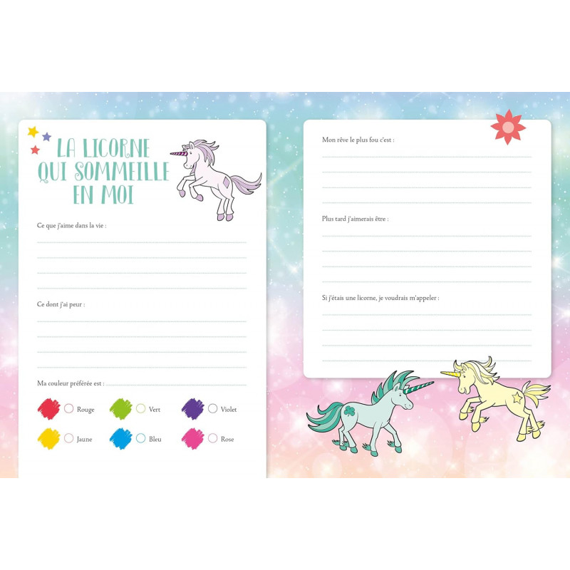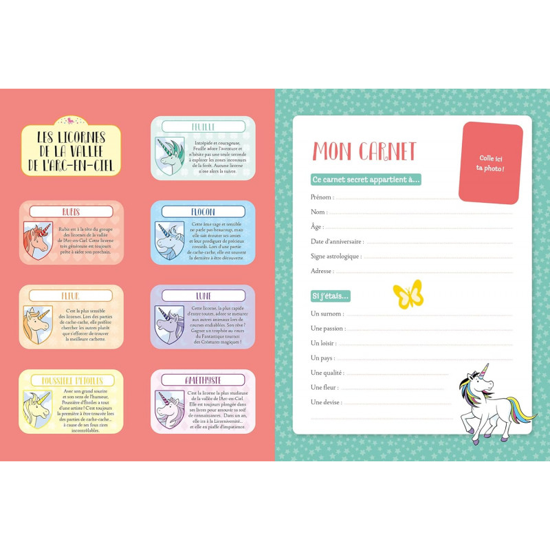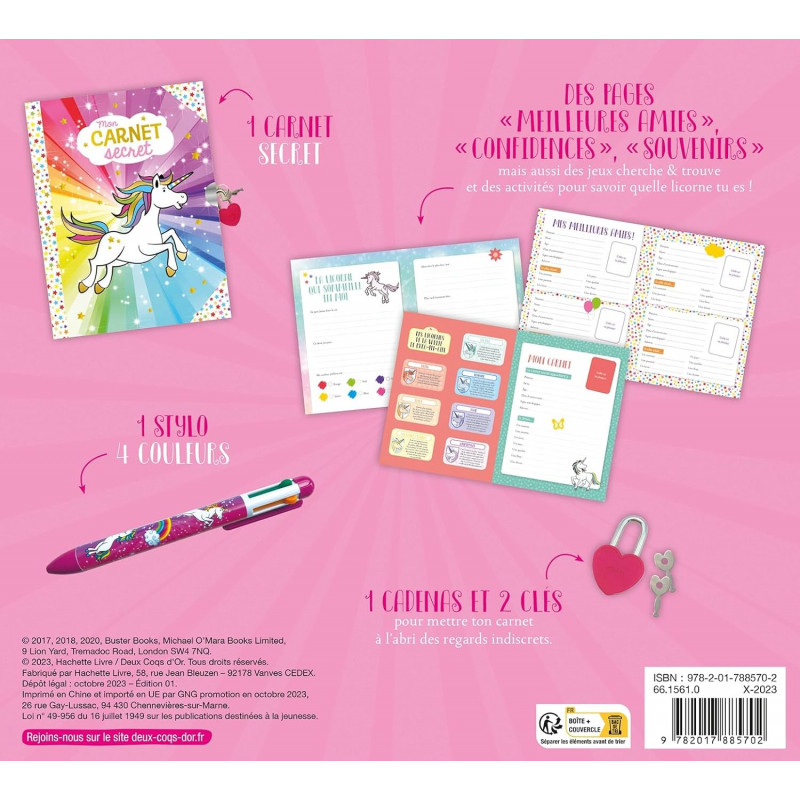 Un carnet secret, un stylo 4 couleurs, un cadenas et deux clés pour mettre ton carnet à l’abri des regards indiscrets. Des pages « meilleures amies », « confidences », « souvenirs » mais aussi des jeux cherche et trouve et des activités pour savoir quelle licorne tu es !