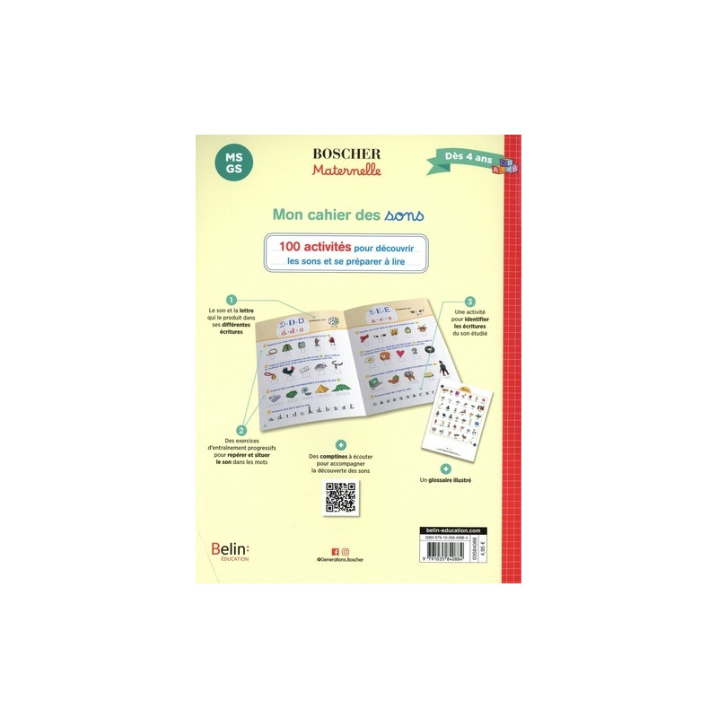 Mon cahier des sons présente de manière progressive tous les sons de la langue française et les lettres qui les composent. Chaque son est présenté en 3 temps : Le son et la lettre qui le produit dans ses différentes écritures Des exercices pour vérifier sa bonne compréhension et mettre le son en contexte Une activité pour apprendre à reconnaître l'écriture de la lettre étudiée Avec en plus : Un glossaire illustré en fin d'ouvrage De nombreux conseils pour se préparer à la lecture