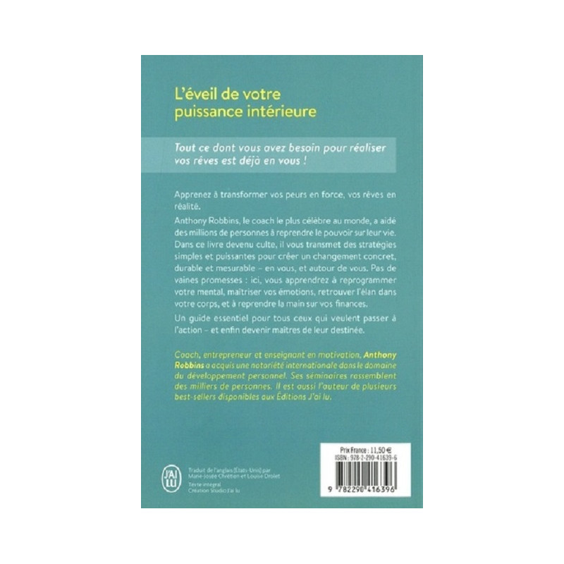 Apprenez à transformer vos peurs en force, vos rêves en réalité. Anthony Robbins, le coach le plus célèbre au monde, a aidé des millions de personnes à reprendre le pouvoir sur leur vie. Dans ce livre devenu culte, il vous transmet des stratégies simples et puissantes pour créer un changement concret, durable et mesurable - en vous, et autour de vous. Pas de vaines promesses : ici, vous apprendrez à reprogrammer votre mental, maîtriser vos émotions, retrouver l'élan dans votre corps, et à reprendre la main sur vos finances.
