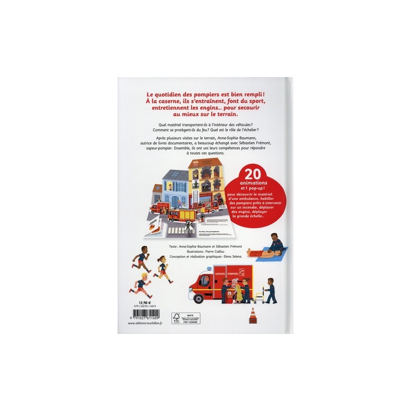 Le livre animé des pompiers : accompagne les pompiers dans leur quotidien, à la caserne et sur le terrain ! 20 animations et 1 pop-up pour découvrir le matériel d'une ambulance, habiller des pompiers prêts à intervenir sur un incendie, déplacer des engins,...