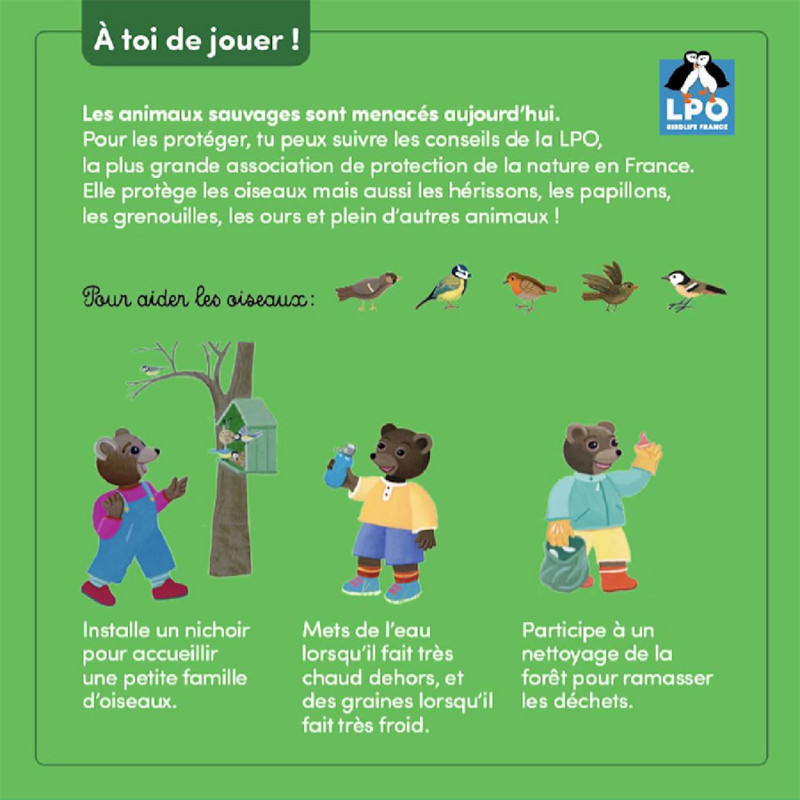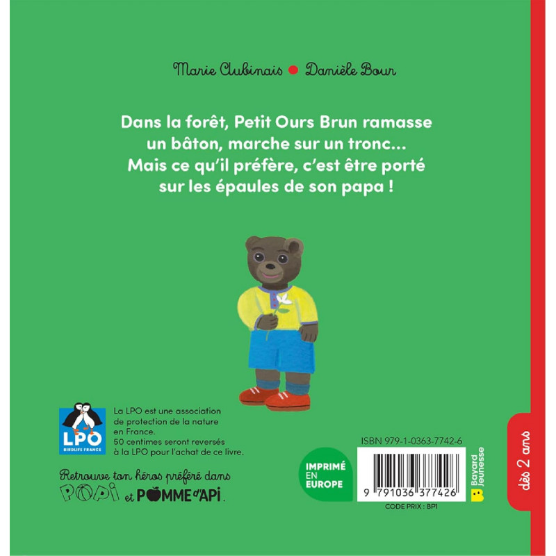 Petit Ours Brun se promène en forêt avec ses parents. Il découvre la nature en ramassant un bâton, puis relève le défi de marcher sur un gros tronc sans tomber. C'est un moment de fierté et d'accomplissement pour lui, et ses parents l'encouragent avec enthousiasme. Bravo, Petit Ours ! Partenariat LPO x Bayard Jeunesse Une sortie en partenariat avec la LPO, - Ligue pour la Protection des Oiseaux - qui agit au quotidien pour la protection des espèces, la préservation des milieux naturels et l'éducation à l'environnement. 50 centimes seront reversés à cette association pour l'achat de ce titre. Célébrer la nature La promenade en forêt offre l'occasion d'explorer la nature : toucher l'écorce des arbres, observer les plantes, ramasser des bâtons ou des feuilles. Ces moments simples éveillent la curiosité des enfants et leur permettent de se connecter à l'environnement, tout en développant leur respect pour la nature. Un terrain de jeu pour se dépenser Marcher sur un tronc, sauter dans une flaque ou courir entre les arbres sont des activités amusantes qui stimulent l'imagination des enfants. Elles leur permettent non seulement de se dépenser, mais aussi d'explorer leur environnement naturel, de développer leur motricité, leur équilibre et leur coordination tout en s'amusant.