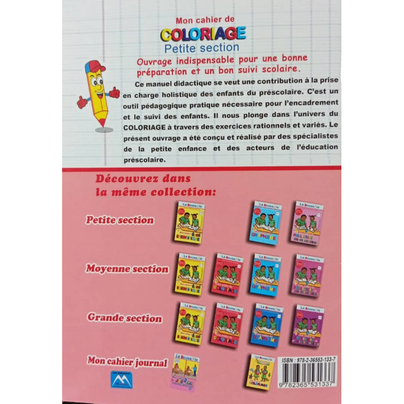 Mon cahier de COLORIAGE Petite section Ouvrage indispensable pour une bonne préparation et un bon suivi scolaire. Ce manuel didactique se veut une contribution à la prise en charge holistique des enfants du préscolaire. C'est un outil pédagogique pratique nécessaire pour l'encadrement et le suivi des enfants. Il nous plonge dans l'univers du COLORIAGE à travers des exercices rationnels et variés. Le présent ouvrage a été conçu et réalise par des spécialistes de la petite enfance et des acteurs de l'éducation préscolaire.