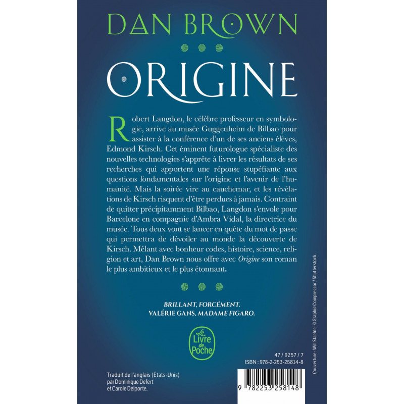 Contraint de quitter précipitamment Bilbao, Langdon s'envole pour Barcelone en compagnie d'Ambra Vidal, la directrice du musée. Tous deux vont se lancer en quête du mot de passe qui permettra de dévoiler au monde la découverte de Kirsch. Mêlant avec bonheur codes, histoire, science, religion et art, Dan Brown nous offre avec Origine son roman le plus ambitieux et le plus étonnant. Brillant, forcément.