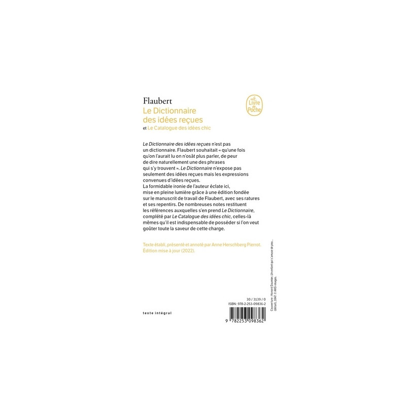 Le Dictionnaire des idées reçues n’est pas un dictionnaire. Flaubert souhaitait «qu’une fois qu’on l’aurait lu on n’osât plus parler, de peur de dire naturellement une des phrases qui s’y trouvent». Le Dictionnaire n’expose pas seulement des idées reçues mais les expressions convenues d’idées reçues. Et, de cette œuvre d’une vie, Flaubert se voulait absent : « Il faudrait que, dans tout le cours du livre, il n’y eût pas un mot de mon cru.» Or rien de plus présent, rien de plus tangible ici que la formidable ironie de l’auteur mise en pleine lumière grâce à une édition fondée sur le manuscrit de travail de Flaubert, avec ses ratures et ses repentirs. De nombreuses notes restituent les références auxquelles s’en prend Le Dictionnaire, complété par Le Catalogue des idées chic, celles-là mêmes qu’il est indispensable de posséder si l’on veut goûter toute la saveur de cette charge.