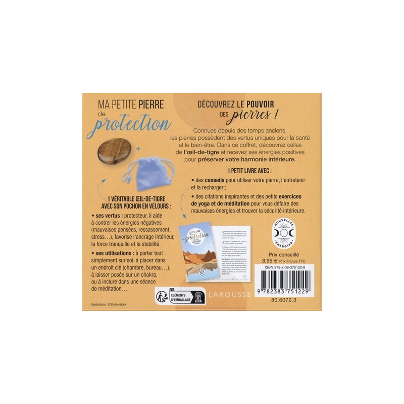 Découvrez le pouvoir des pierres ! Connues depuis des temps anciens, les pierres possèdent des vertus uniques pour la santé et le bien-être. Dans ce coffret, découvrez celles de l’œil-de-tigre et recevez ses énergies positives pour préserver votre harmonie intérieure. • 1 véritable œil-de-tigre avec son pochon en velours : - ses vertus : protecteur, il aide à contrer les énergies négatives (mauvaises pensées, ressassement, stress…), favorise l’ancrage intérieur, la force tranquille et la stabilité. - ses utilisations : à porter tout simplement sur soi, à placer dans un endroit clé (chambre, bureau…), à laisser posée sur un chakra ou à inclure dans une séance de méditation… • 1 petit livre avec : - des conseils pour utiliser votre pierre, l’entretenir et la recharger ; - des citations inspirantes et des petits exercices de yoga et de méditation pour vous défaire des mauvaises énergies et trouver la sécurité intérieure.