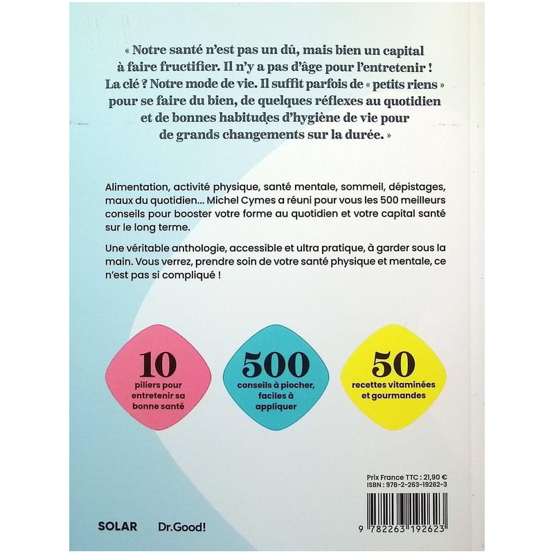 Michel Cymes a réuni pour vous les 500 meilleurs conseils pour booster votre forme au quotidien et votre capital santé sur le long terme. Une véritable anthologie, accessible et ultra pratique, à garder sous la main. Vous verrez, prendre soin de votre santé physique et mentale, ce n'est pas si compliqué ! - 10 piliers pour entretenir sa bonne santé - 500 conseils à piocher, faciles à appliquer - 50 recettes vitaminées et gourmandes