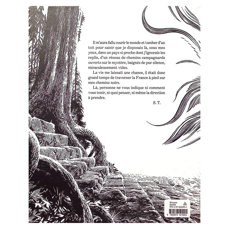"Il m'aura fallu courir le monde et tomber d'un toit pour saisir que je disposais là, sous mes yeux, dans un pays si proche dont j'ignorais les replis, d'un réseau de chemins campagnards ouverts sur le mystère, baignés de pur silence, miraculeusement vides. La vie me laissait une chance, il était donc grand temps de traverser la France à pied sur mes chemins noirs. Là, personne ne vous indique ni comment vous tenir, ni quoi penser, ni même la direction à prendre".