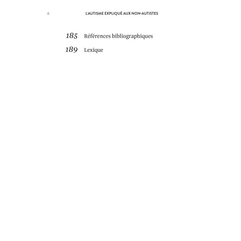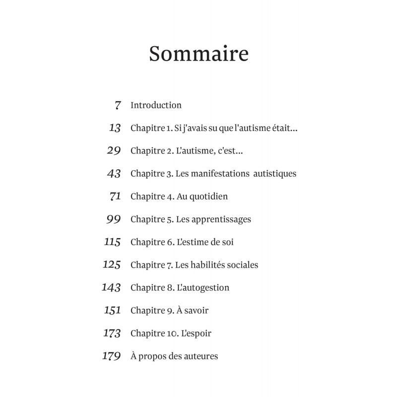 Pour une nouvelle perception de la condition autistique Ce livre propose, à travers une cinquantaine de questions concrètes, de comprendre les personnes autistes et à mieux répondre à leurs besoins au quotidien. Les auteures ont conçu ce livre à travers trois points de vue : celui d’une personne autiste, celui du parent et celui du professionnel expérimenté. Elles nous dévoilent des pistes inédites issues des neurosciences, de leurs recherches cliniques mais aussi de leur vécu (Brigitte Harrisson est autiste, et Kim Thúy, maman d’un enfant autiste). Afin de placer la condition autistique au centre.