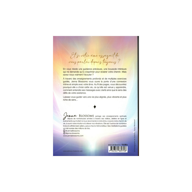 À travers des enseignements profonds et de multiples exercices guidés, Jenna Blossoms nous ouvre la porte d'une connexion intime et simple avec votre âme. Et si votre âme essayait de vous parler depuis toujours ? En vous réside une guidance précieuse, une boussole intérieure qui ne demande qu'à s'exprimer pour éclairer votre chemin. Mais savez-vous vraiment l'écouter ? À travers des enseignements profonds et de multiples exercices guidés, Jenna Blossoms vous ouvre la porte d'une connexion intime et simple avec votre âme. Au fil des pages, vous découvrirez pourquoi elle a choisi cette vie, ce qu'elle est venue y apprendre, comment entendre ses messages avec clarté ainsi que le sens des défis de votre existence. Laissez-vous guider vers une vie plus alignée, plus vibrante et plus riche de sens...