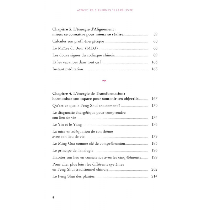 « Comprendre son énergie et son environnement, c’est reprendre le pouvoir sur sa vie. » Grâce aux principes millénaires du Feng Shui et de l’astrologie chinoise, deux sciences ancestrales, vous découvrirez comment décrypter votre énergie, réharmoniser vos lieux de vie et avancer avec confiance dans une nouvelle ère en plein bouleversement. Au fil des pages, vous apprendrez à activer : l’énergie d’Éveil – s’ouvrir à l’invisible et à l’intuition ; l’énergie de Clarté – décrypter votre carte astrologique ; l’énergie d’Alignement – mieux vous connaître pour mieux choisir ; l’énergie de Transformation – faire de votre maison une alliée grâce au Feng Shui ; l’énergie d’Équilibre – harmoniser les 5 éléments au quotidien. Accessible, illustré d’exemples concrets et de témoignages, ce guide pratique vous accompagnera pas à pas pour intégrer facilement ces principes dans votre vie et en tirer des bénéfices immédiats. Prêt à activer les 5 énergies qui changeront votre vie ?